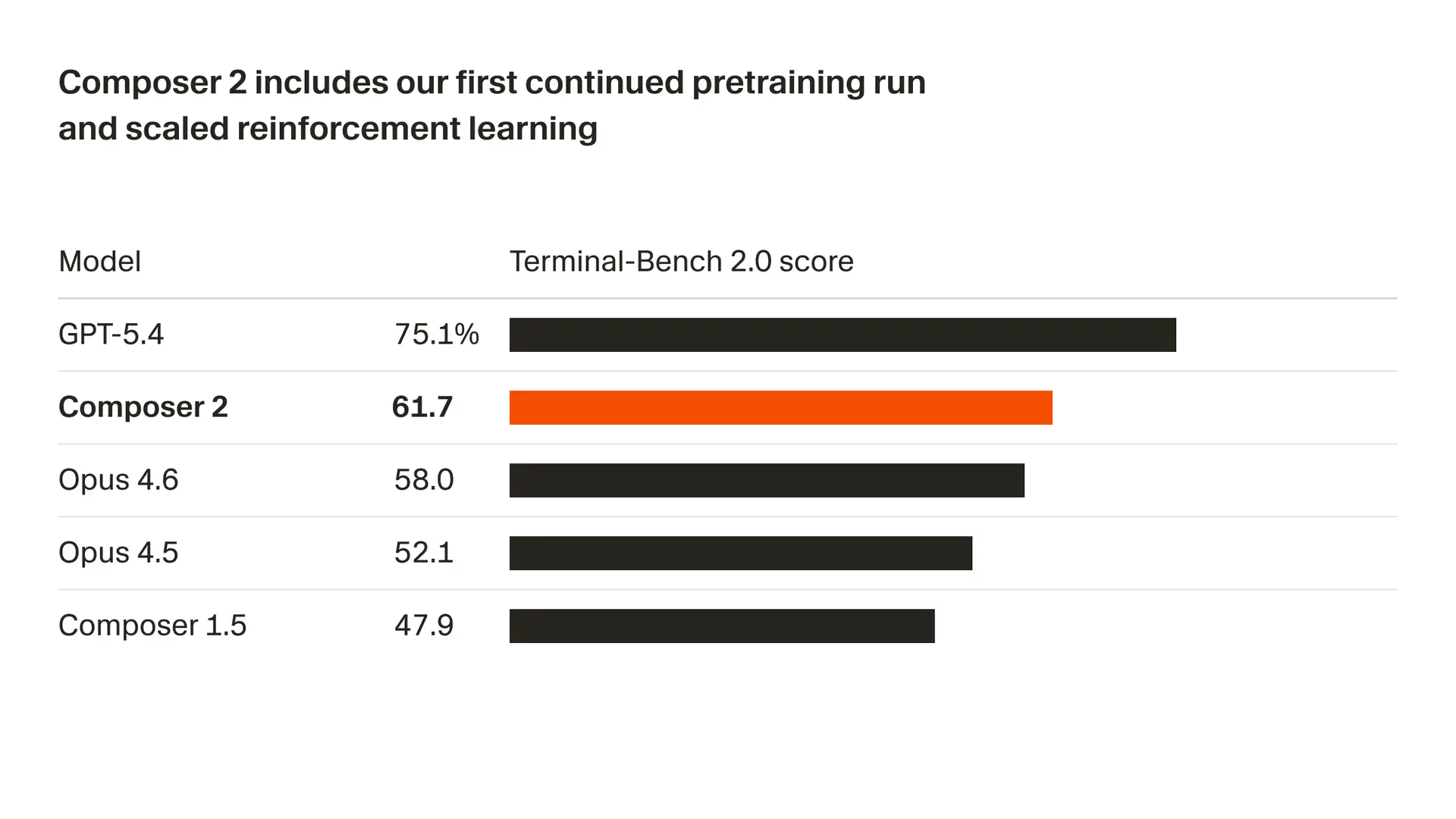 我们正在快速提升模型质量。Composer 2 在我们衡量的所有基准测试上都取得了大幅提升,其中包括 Terminal-Bench 2.01 和 SWE-bench Multilingual: