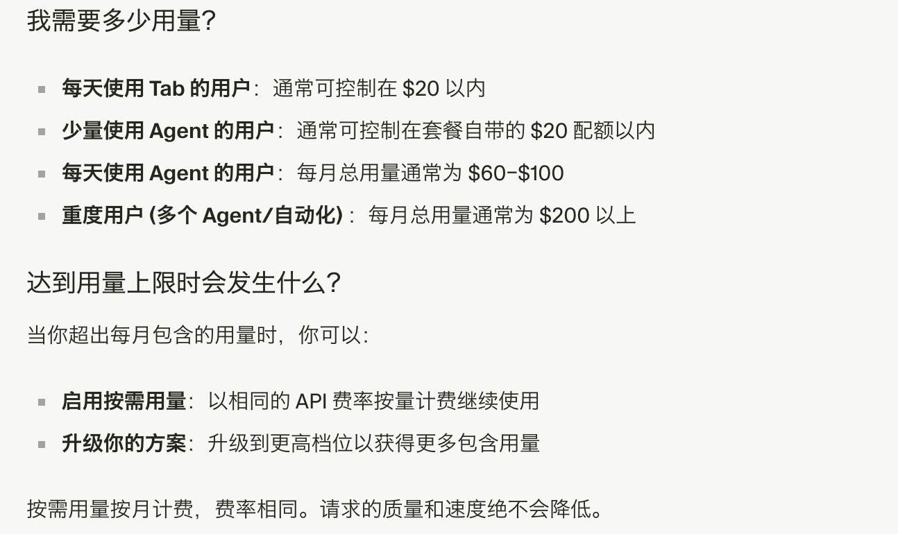 Cursor 套餐的使用量按各模型 API 的计费标准计算。例如,Pro 套餐中包含的 20 美元用量,会根据你选择的模型及其价格逐步消耗。